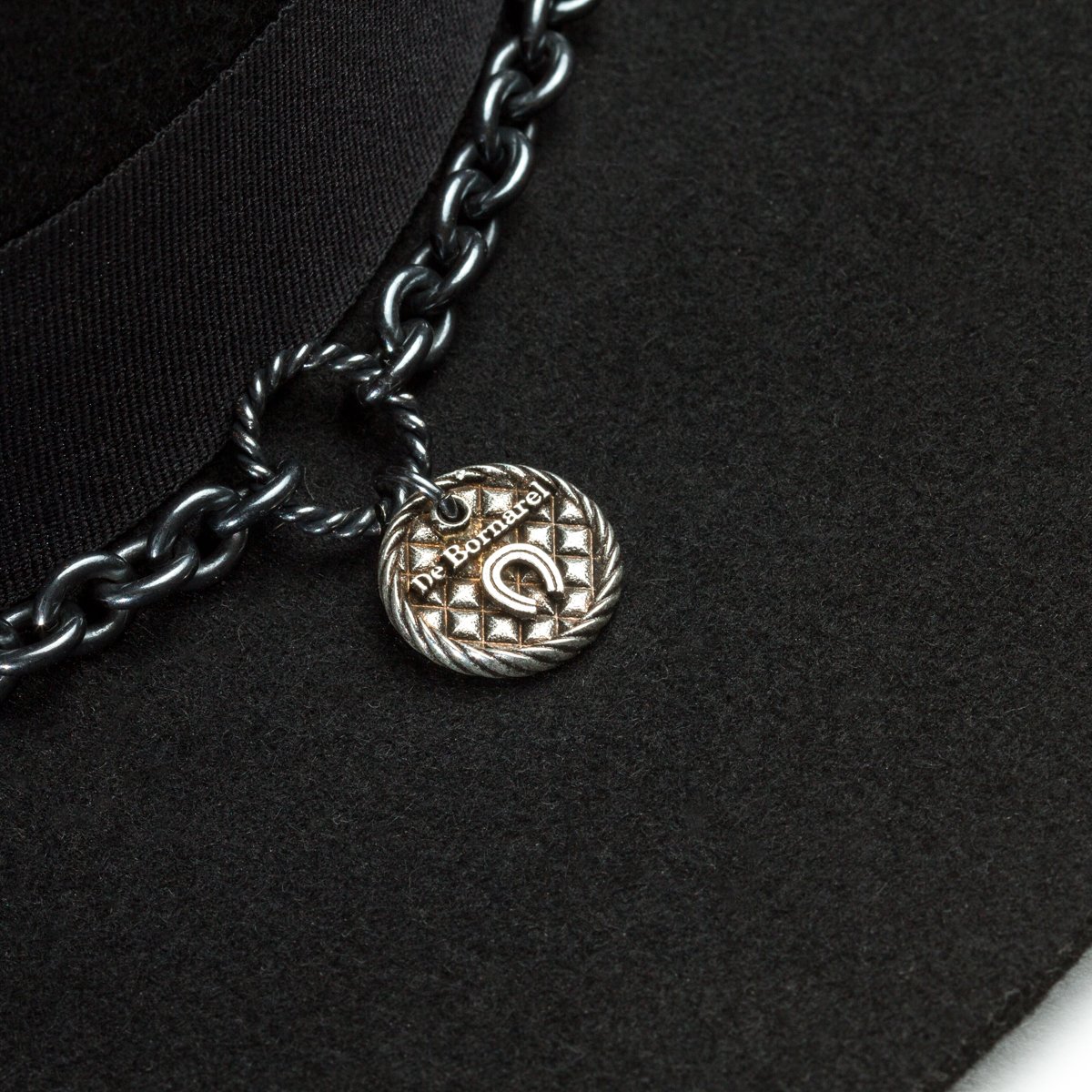 Les chapeaux sont disponibles en laine noire avec une chaine noire ou une chaine argenté ou en laine grise avec une chaine noire ou une chaine argenté