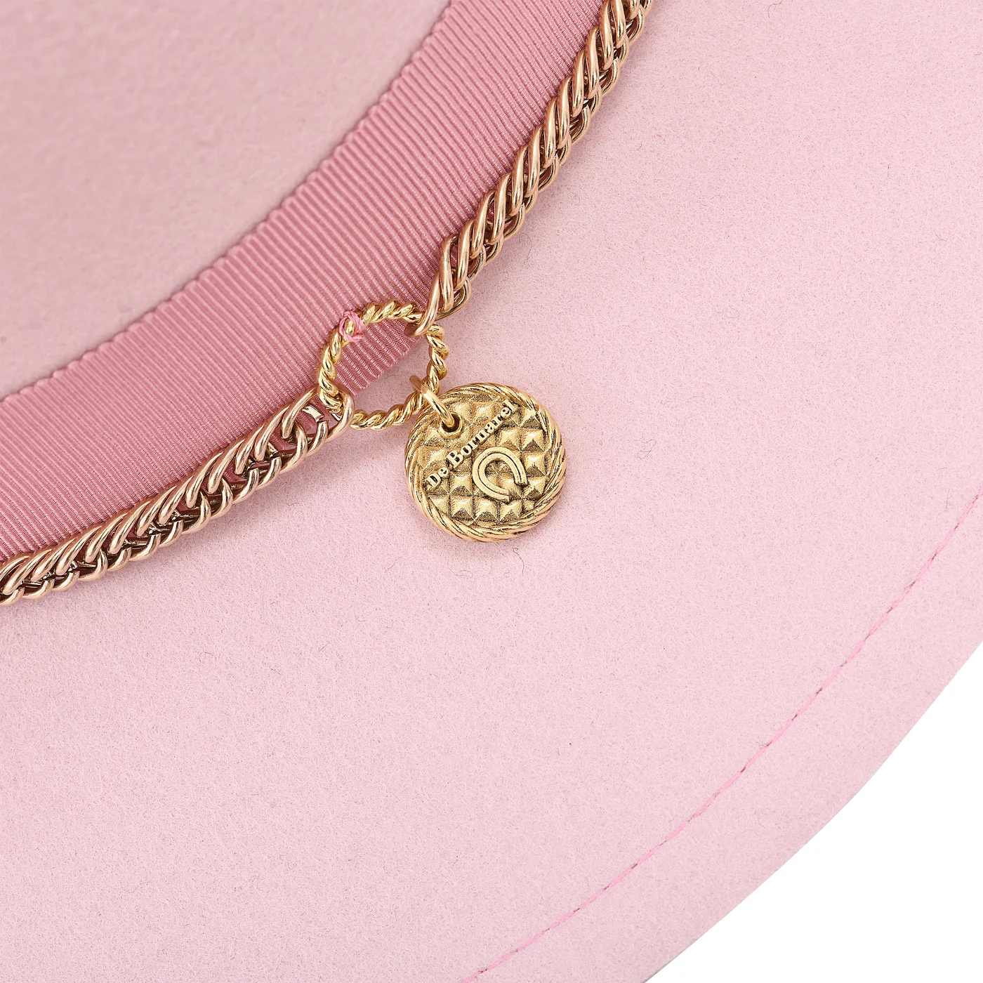 THE HATS ARE AVAILABLE IN BLACK OR GREY WOOL WITH BLACK AND SILVER CHAIN OR IN BLACK WOOL WITH A BLACK AND GOLD CHAIN
